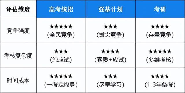 根据竞争强度、考核复杂度、时间成本三方面,将高考统招、强基计划、考研三种路径上985的难度进行了全方面对比,仅供参考。